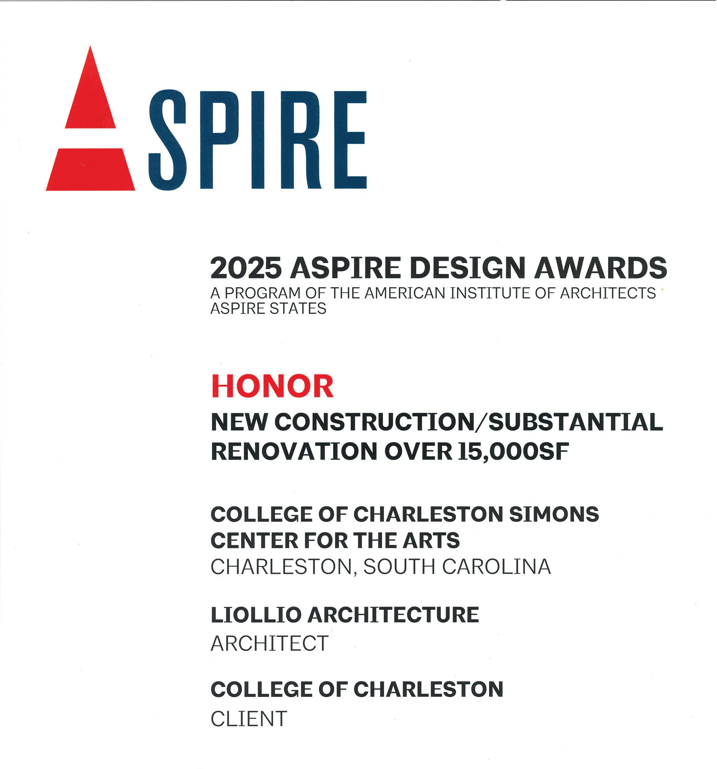 In this time of reflection, gratitude and celebration, Liollio is so grateful to our wonderful clients who invest in thoughtful buildings and spaces to serve our communities! This year, AIA South Atlantic Region recognized the College of Charleston with an AIA South Atlantic Region (SAR) ASPIRE Honor Award for the renovation and expansion of the Simons Center for the Arts. We are honored to have collaborated with the College, our friends at HGA, and our entire project team on this award-winning project. Exceptional projects are the result of collaboration with visionary clients!